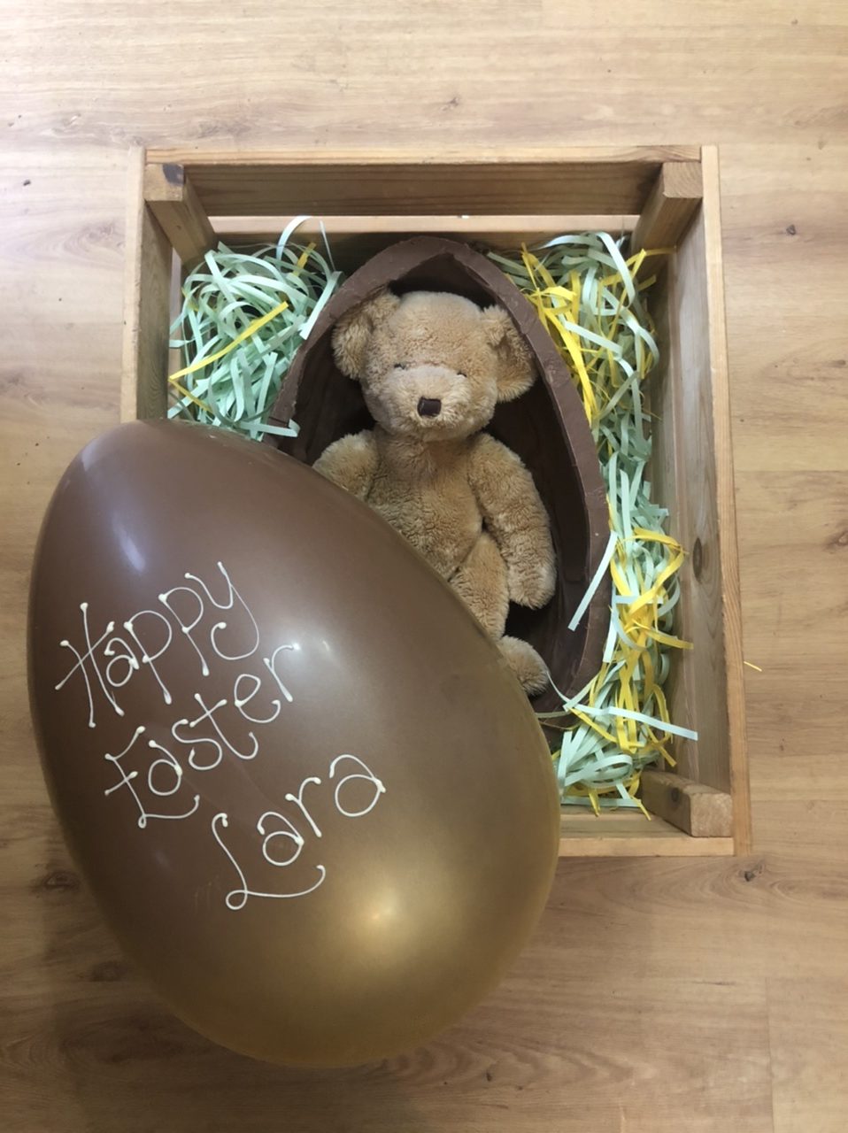 Set in its own wooden crate, shimmering in gold and personalised with your personal greeting written in chocolate on the front. The choice of having the egg empty or you could fill it a bottle of Fairfax Spirit and glasses, or maybe a Teddy Bear to show your ‘softer’ side…. or we can place any item in there that you wish to supply!